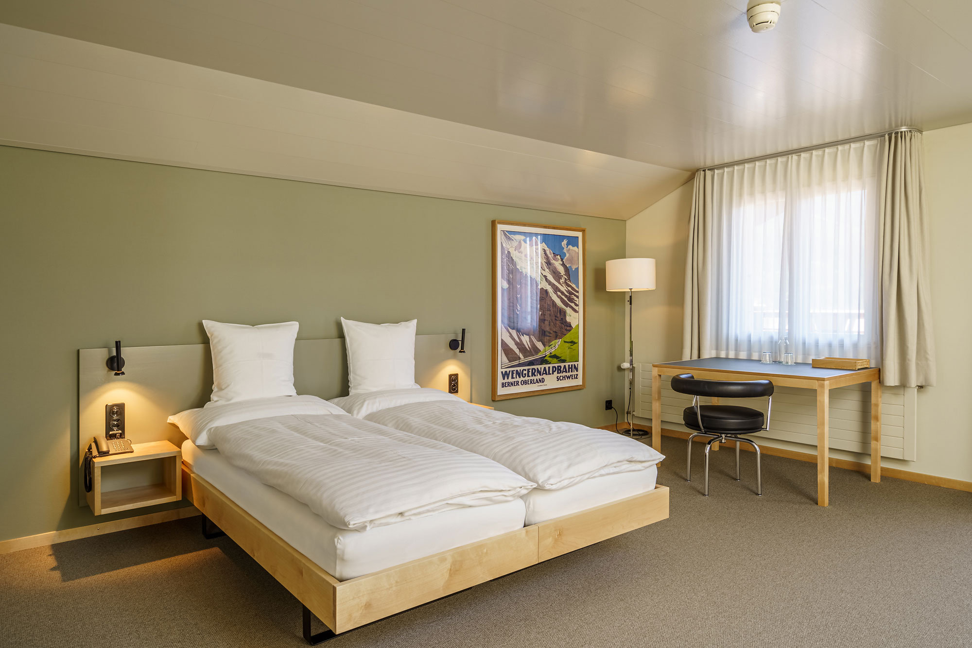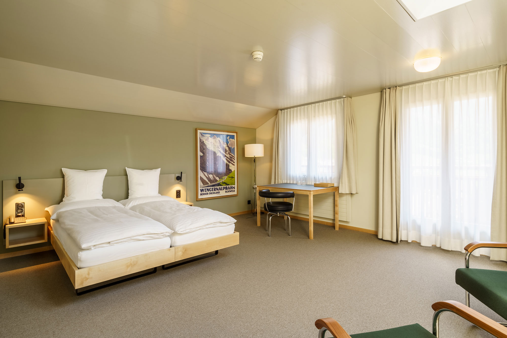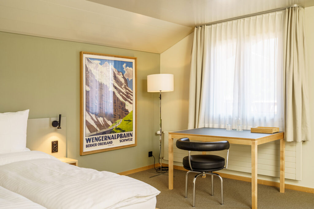 Ces chambres orientées sud disposent d’un balcon avec vue panoramique sur les Alpes bernoises et sur la Jungfrau. Chaque chambre dispose d’une salle de bain individuelle avec douche ou baignoire, télévision, d’un bureau et wi-fi gratuit. Les lits sont confortables et pourvus de draps en lin, classiques, de haute qualité.